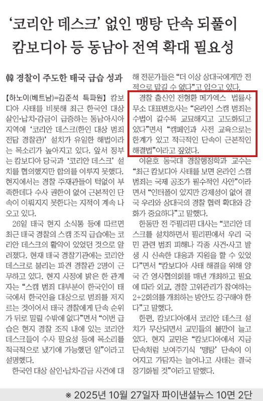 ※ 출처: 파이낸셜뉴스 하노이(베트남)=김준석 특파원, 「'코리안 데스크’ 없인 맹탕 단속 되풀이.. 캄보디아 등 동남아 전역 확대 필요성」, 2025년 10월 26일