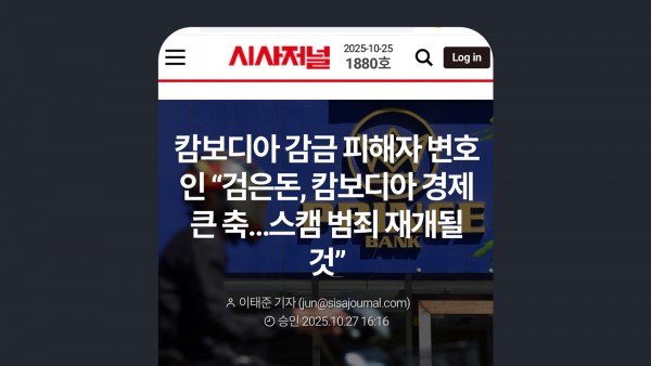 ※ 출처: 시사저널 이태준 기자, 「캄보디아 감금 피해자 변호인 “검은돈, 캄보디아 경제 큰 축…스캠 범죄 재개될 것”」, 2025년 10월 27일